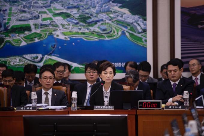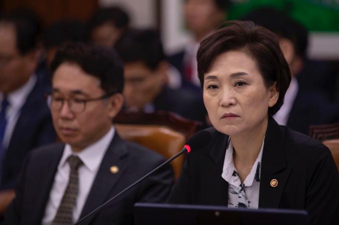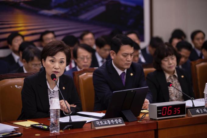 김현미 국토교통부 장관(왼쪽)이 21일 서울 여의도 국회에서 열린 국토교통위원회 소관 국토교통부, 행정중심복합도시건설청, 새만금개발청 마지막 종합국정감사에 출석해 의원 질의에 답하고 있다.