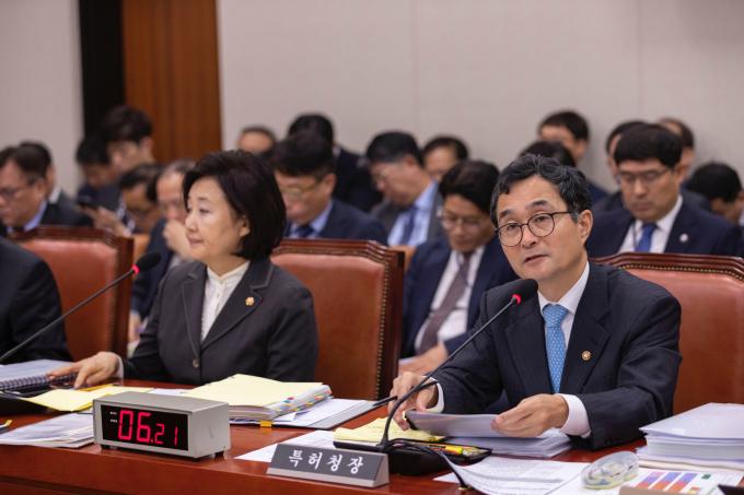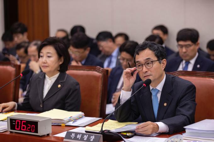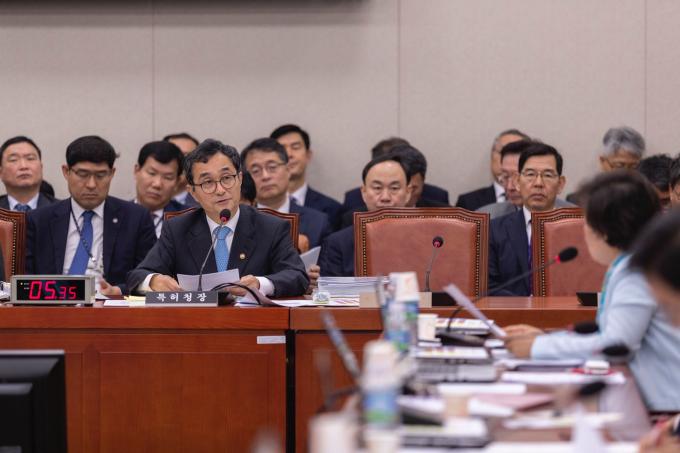 박원주 특허청장이 21일 서울 여의도 국회에서 열린 산업통상자원중소벤처기업위원회 종합국정감사에 출석해 의원 질의에 답하고 있다.