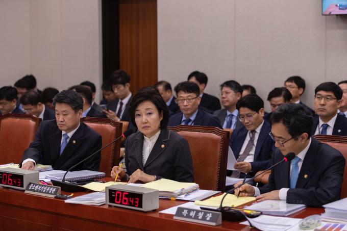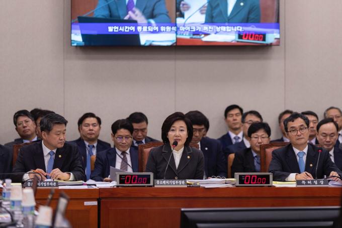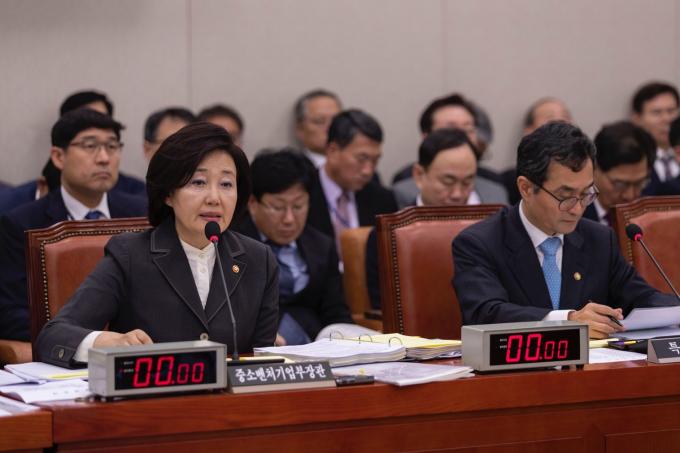 박영선 중소벤처기업부 장관(가운데)이 21일 서울 여의도 국회에서 열린 산업통상자원중소벤처기업위원회 종합국정감사에 출석해 의원 질의에 답하고 있다.