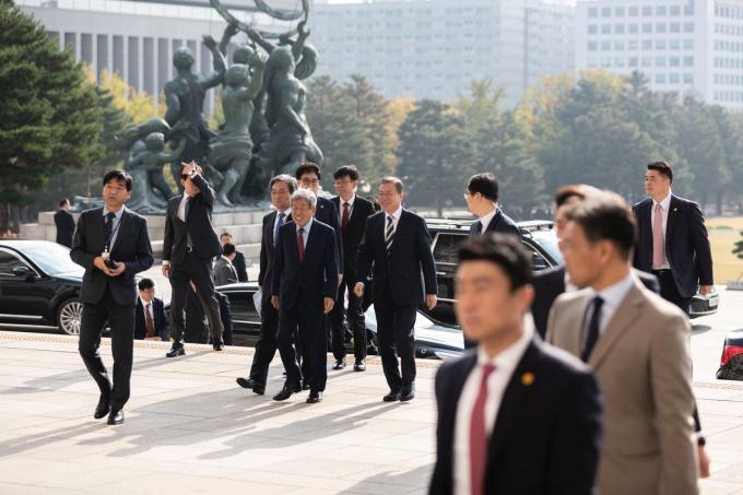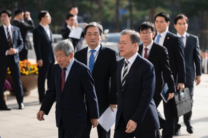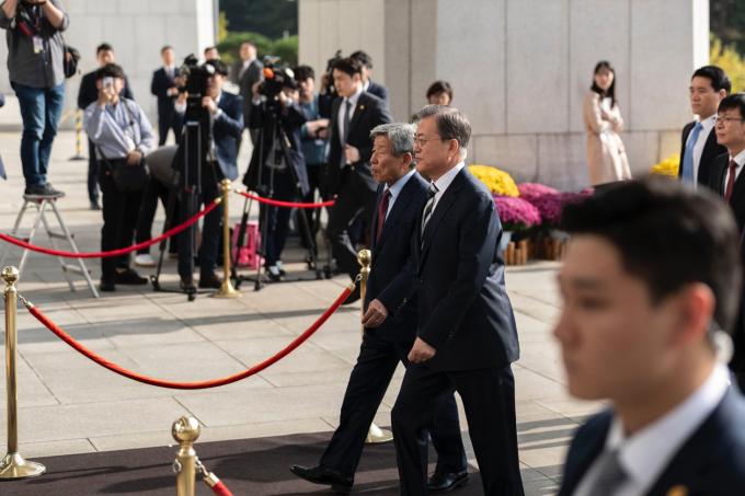 문재인 대통령이 내년도 예산안에 대한 정부 시정연설을 위해 22일 오전 서울 여의도 국회를 방문해 유인태 사무총장의 영접을 받으며 국회의사당 현관으로 들어서고 있다.