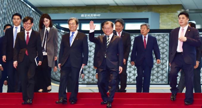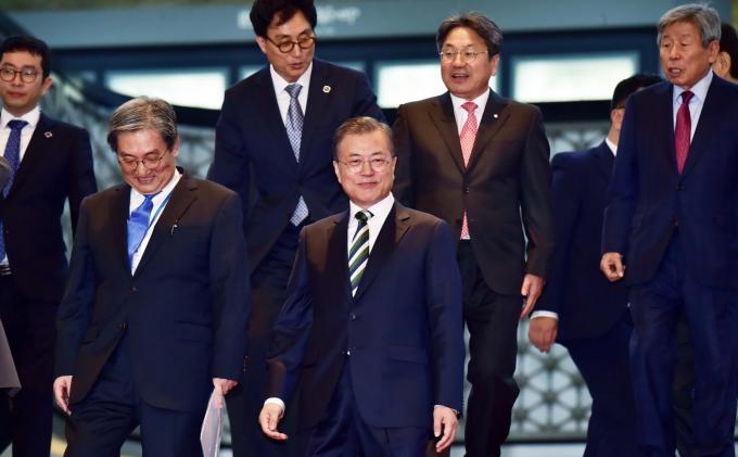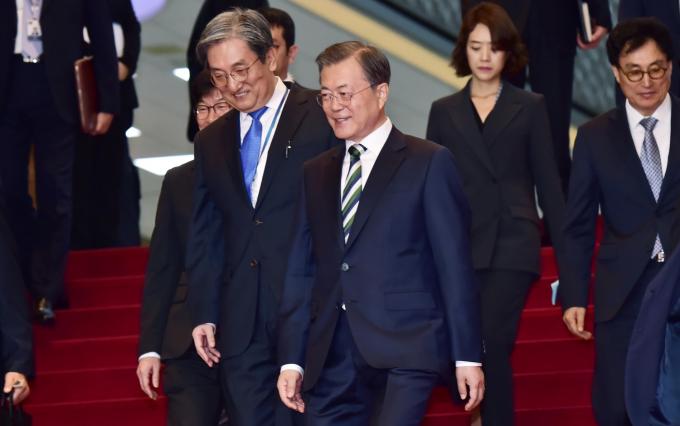 문재인 대통령이 22일 오전 서울 여의도 국회 본회의장에서 2020년 예산안 시정연설을 마치고 로텐더홀을 나서고 있다. [국회사진취재단]