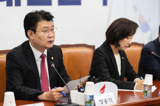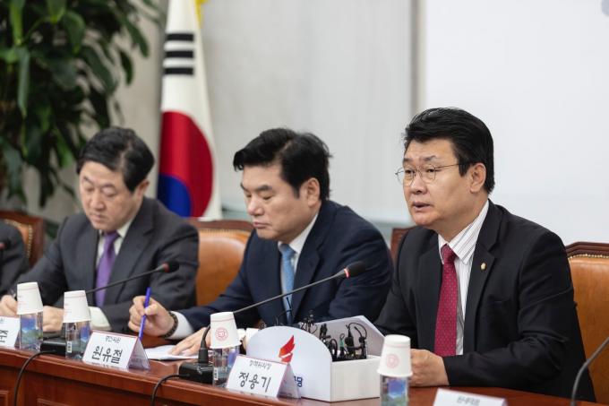 자유한국당 정용기 정책위의장(왼쪽)가 23일 오전 서울 여의도 국회에서 열린 한국당 원내대표-중진의원 회의에 참석해 발언하고 있다.