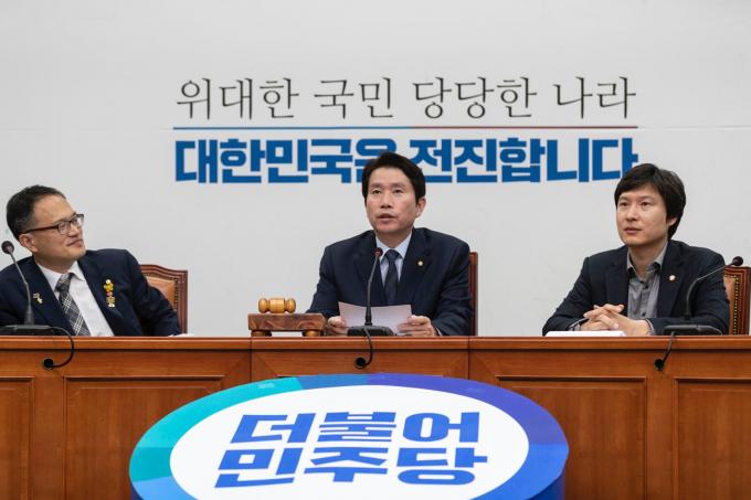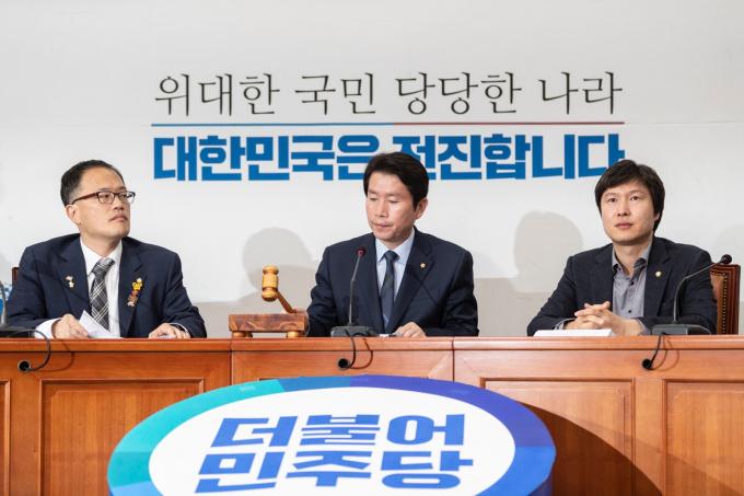 더불어민주당 이인영 원내대표(가운데)가 23일 오전 서울 여의도 국회에서 민주당 최고위원회의를 개의하고 있다.