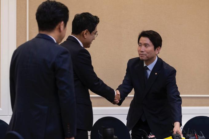 더불어민주당 이인영 원내대표(오른쪽)와 바른미래당 오신환 원내대표가 23일 오후 서울 여의도 국회에서 열린 '여야3당 교섭단체 선거법 3+3회동'에 참석해 악수하고 있다.
