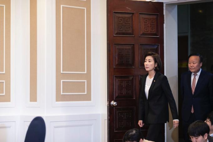 자유한국당 나경원 원내대표(왼쪽)와 김재원 의원이 23일 오후 서울 여의도 국회에서 열린 '여야3당 교섭단체 선거법 3+3회동'에 참석하고 있다.