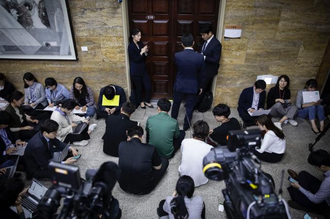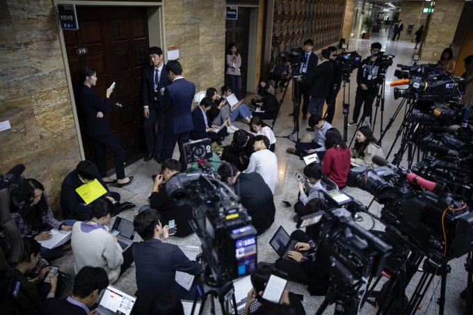 여야 3당 교섭단체 선거법 3+3 회동이 23일 오후 서울 여의도 국회에서 열린 가운데 취재진들이 회동장 앞에서 결과를 기다리고 있다.