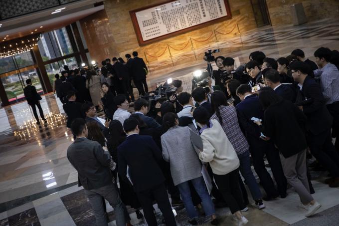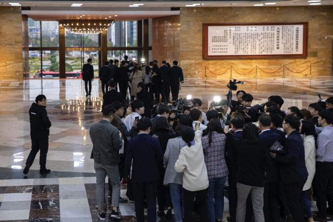 더불어민주당 이인영 원내대표(입구 쪽 무리)와 자유한국당 나경원 원내대표가 23일 오후 서울 여의도 국회에서 여야 3당 교섭단체 선거법 관련 3+3 회동을 마치고 인파에 묻힌 채 취재진 질문에 답하고 있다.