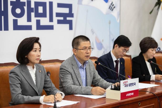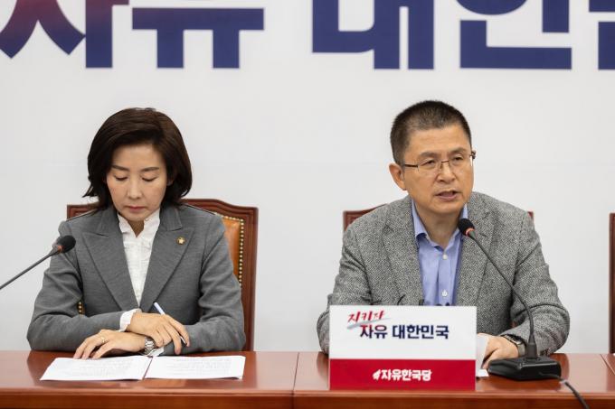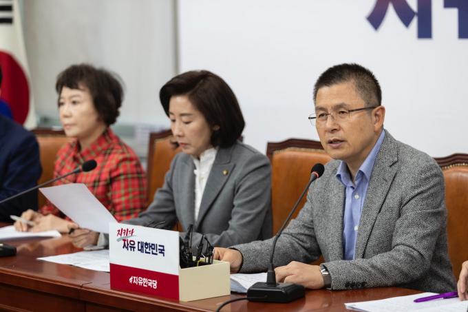 자유한국당 황교안 대표(오른쪽)가 24일 오전 서울 여의도 국회에서 열린 한국당 최고위원회의에 참석해 발언하고 있다.