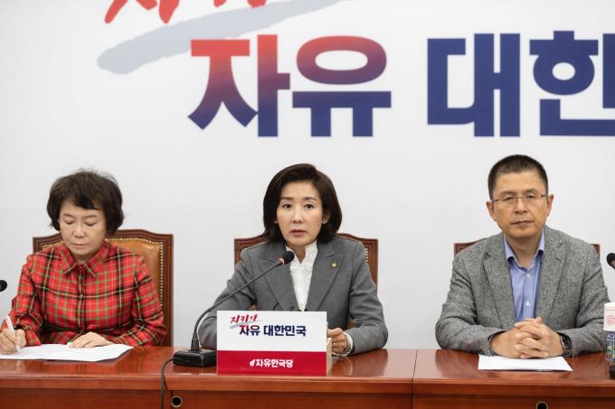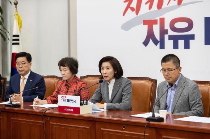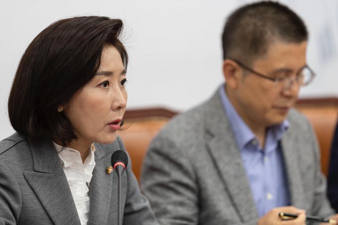 자유한국당 나경원 원내대표(왼쪽)가 24일 오전 서울 여의도 국회에서 열린 한국당 최고위원회의에 참석해 발언하고 있다.