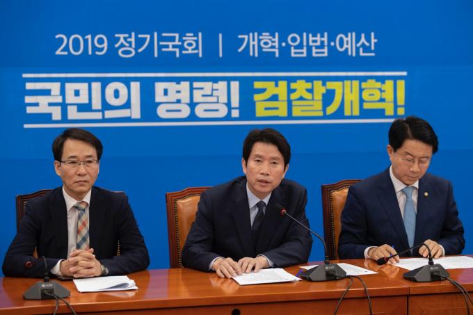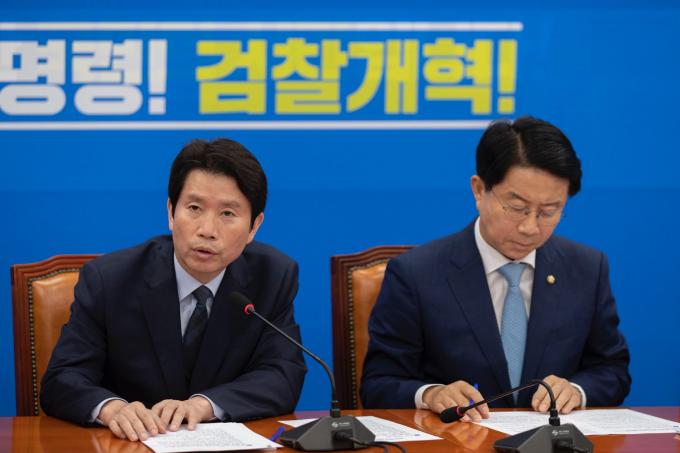 더불어민주당 이인영 원내대표(가운데)가 24일 오전 서울 여의도 국회에서 열린 민주당 정책조정회의에 참석해 발언하고 있다.