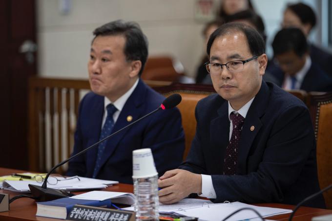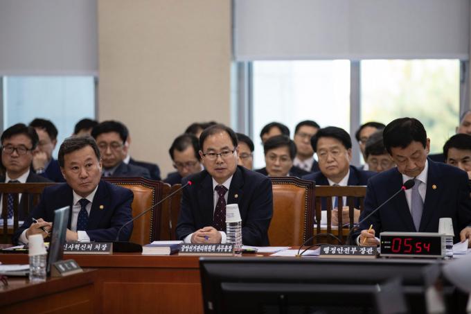 박영수 중앙선거관리위원회 사무총장(오른쪽)이 24일 오후 서울 여의도 국회에서 열린 행정안전위원회 종합국정감사(행정안전부, 중앙선거관리위원회, 인사혁신처, 경찰청, 소방청 등)에 출석해 의원 질의를 듣고 있다.