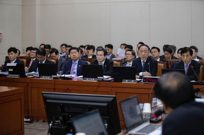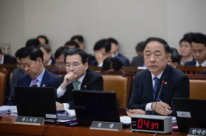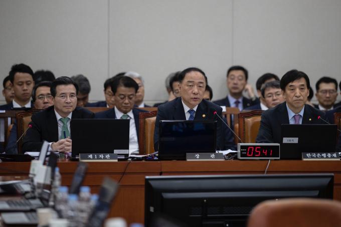 홍남기 부총리 겸 기획재정부 장관(가운데)이 24일 오후 서울 여의도 국회에서 열린 기획재정위원회 국정감사에 출석해 의원 질의에 답하고 있다.