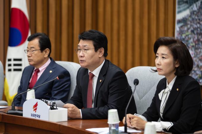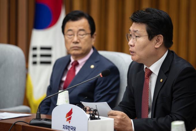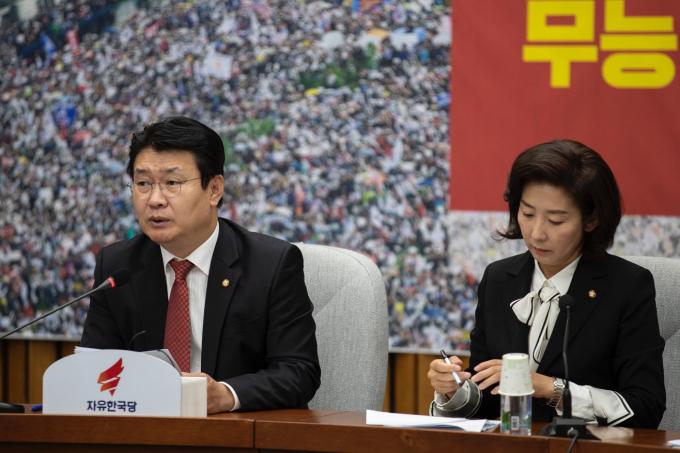 자유한국당 정용기 정책위의장(왼쪽)이 25일 오전 서울 여의도 국회에서 열린 한국당 원내대책회의에 참석해 발언하고 있다.