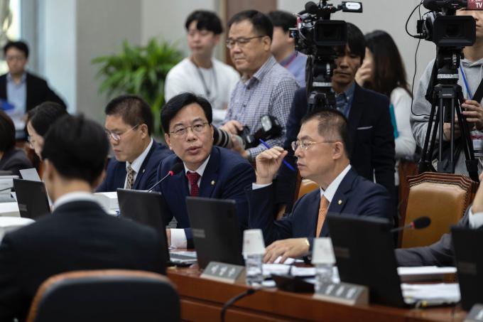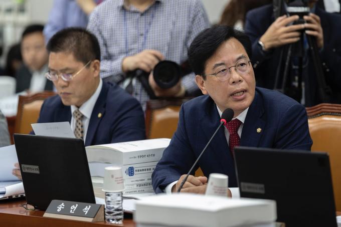 자유한국당 송언석 위원(가운데 붉은 넥타이)이 25일 오전 서울 여의도 국회에서 열린 운영위원회 국정감사(국가인권위원회)에 참석해 증인에게 질의하고 있다.