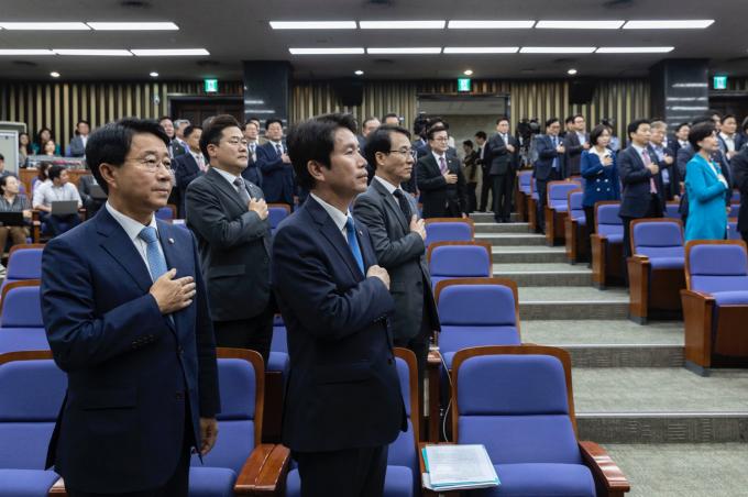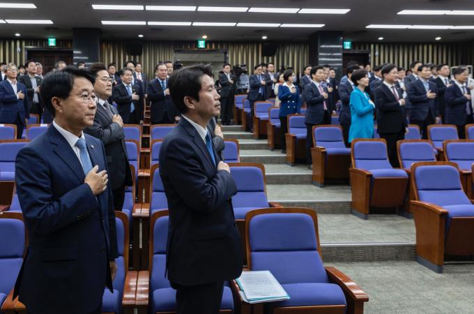더불어민주당 이인영 원내대표(앞줄 오른쪽)와 민주당 의원들이 25일 오후 서울 여의도 국회에서 열린 의원총회에 참석해 국민의례를 하고 있다.