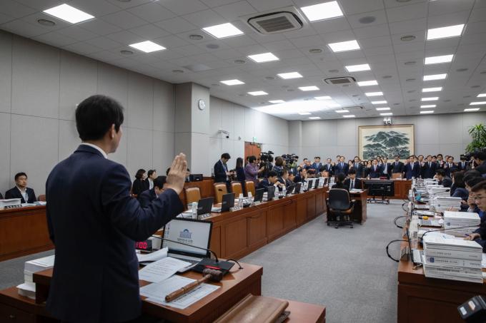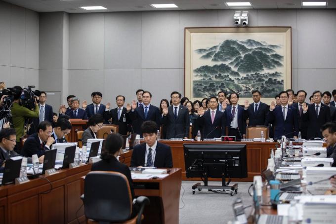 유인태 국회 사무총장(왼쪽 단상)이 25일 오후 서울 여의도 국회에서 열린 운영위원회 국정감사에 출석해 증인선서를 하고 있다.