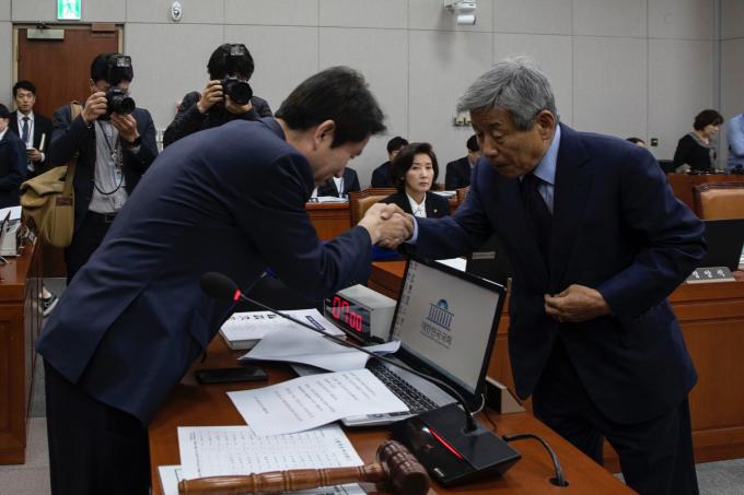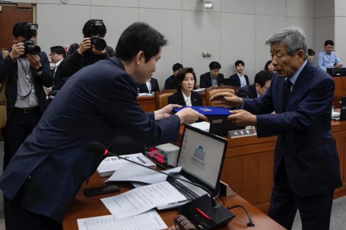 유인태 국회 사무총장(오른쪽)이 25일 오후 서울 여의도 국회에서 열린 운영위원회 국정감사에 출석해 증인선서를 마치고 선서문을 이인영 위원장에게 전달하고 있다.