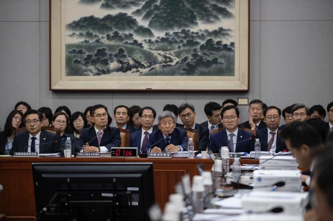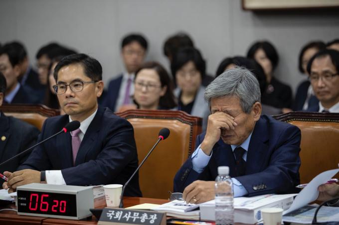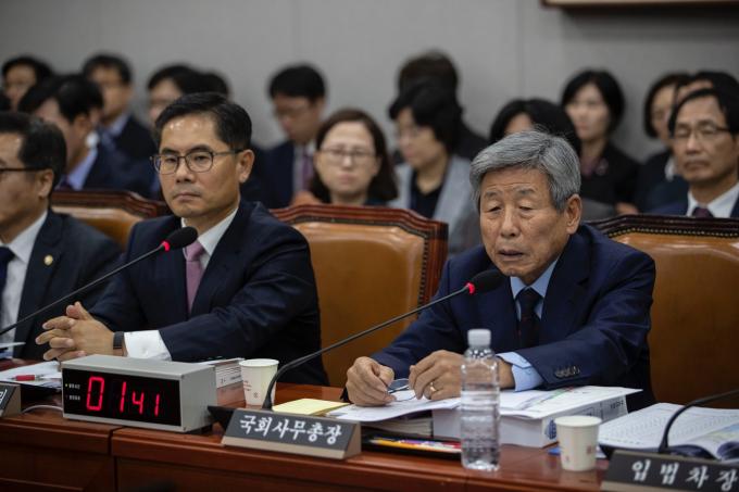 유인태 국회 사무총장(오른쪽)이 25일 오후 서울 여의도 국회에서 열린 운영위원회 국정감사에 출석해 의원 질의에 답하고 있다.