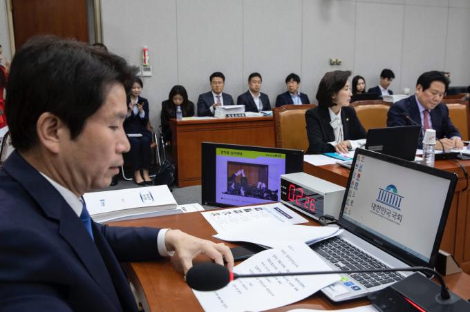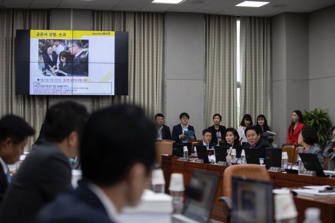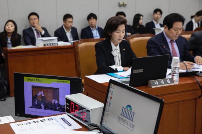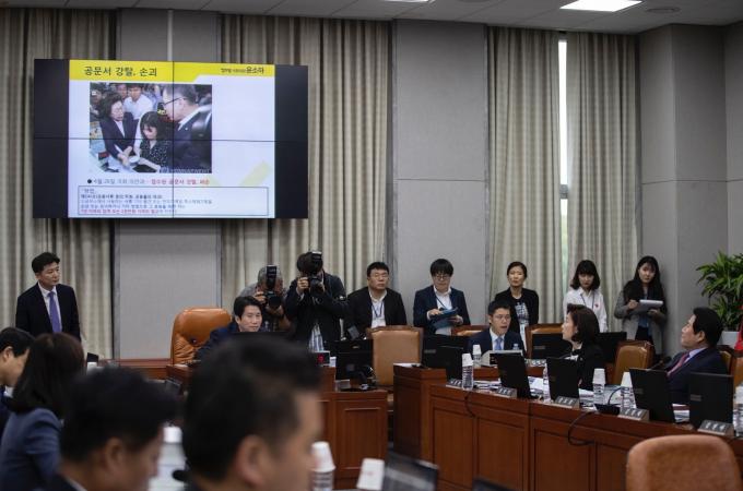 자유한국당 나경원 원내대표를 비롯한 한국당 의원들이 25일 오후 서울 여의도 국회에서 열린 운영위원회 국정감사(국회사무처 등)에 참석해 정의당 윤소하 의원이 준비한 자료화면을 보고 있다.