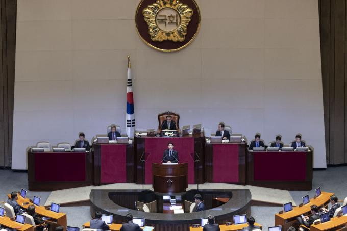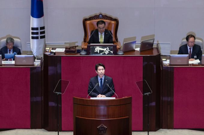 더불어민주당 이인영 원내대표가 28일 오전 서울 여의도 국회에서 열린 제371회 국회(정기회) 제7차 본회의에 참석해 국정에 관한 교섭단체 대표연설을 하고 있다.