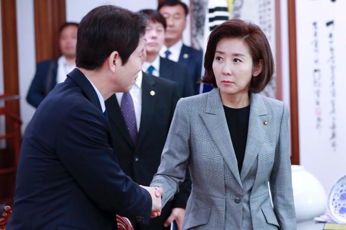 더불어민주당 이인영 원내대표(왼쪽)와 자유한국당 나경원 원내대표가 28일 오전 서울 여의도 국회에서 열린 국회의장-교섭단체회동에 참석해 악수를 하고 있다.