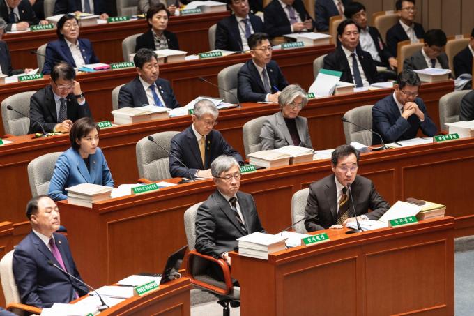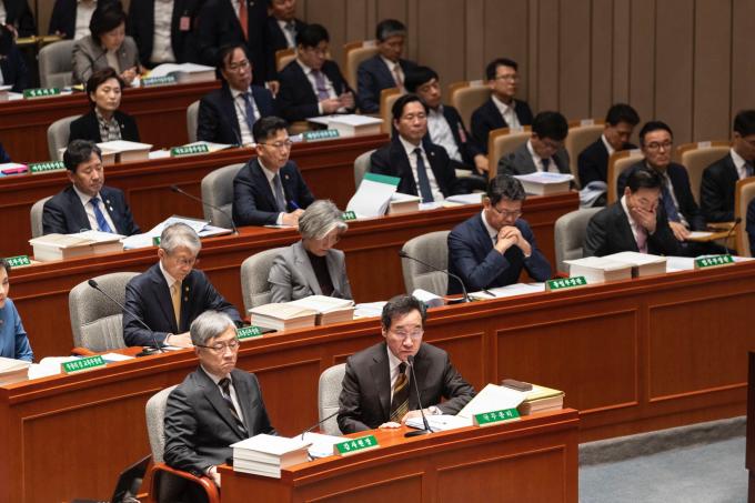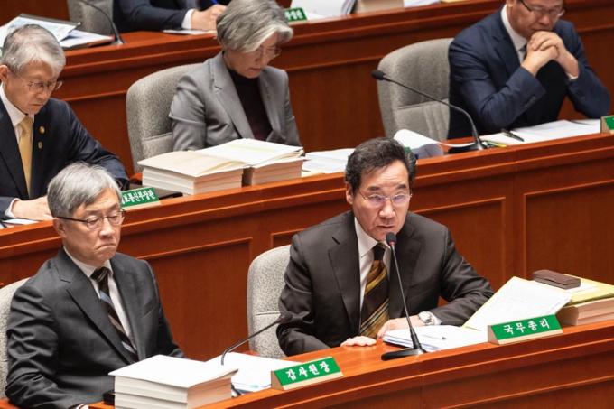 이낙연 국무총리가 28일 오후 서울 여의도 국회에서 열린 예산결산심의위원회 전체회의에 출석해 의원 질의에 답하고 있다.