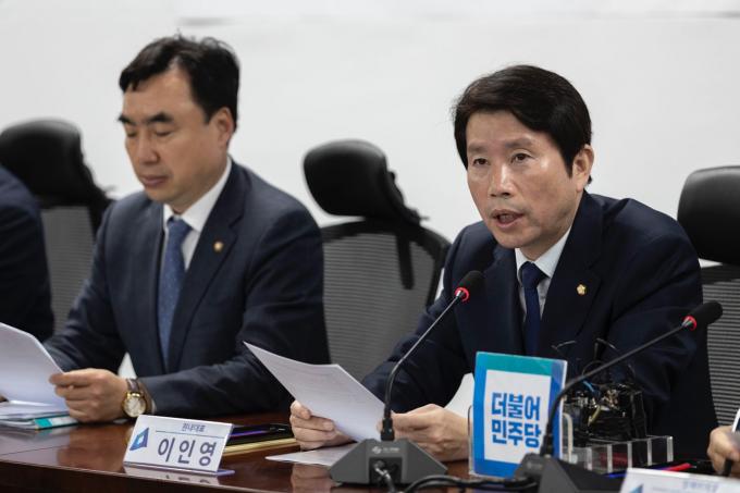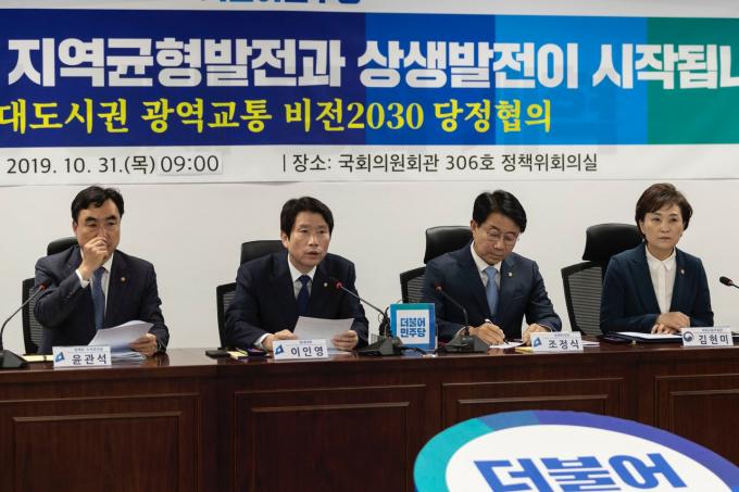 더불어민주당 이인영 원내대표(오른쪽)가 31일 오전 서울 여의도 국회 의원회관에서 열린 '대도시권 광역교통 비전 2030 당정협의'에 참석해 발언하고 있다.