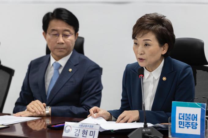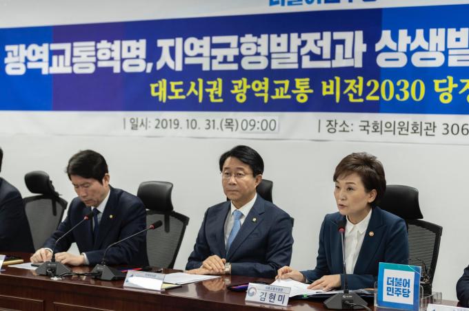 김현미 국토교통부 장관(오른쪽)가 31일 오전 서울 여의도 국회 의원회관에서 열린 '대도시권 광역교통 비전 2030 당정협의'에 참석해 발언하고 있다.