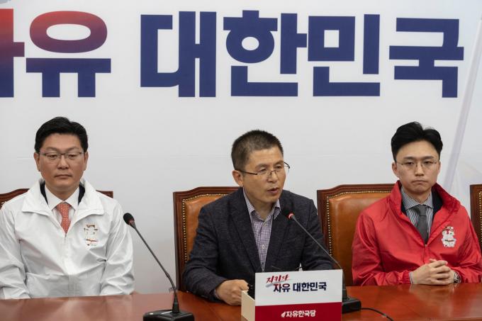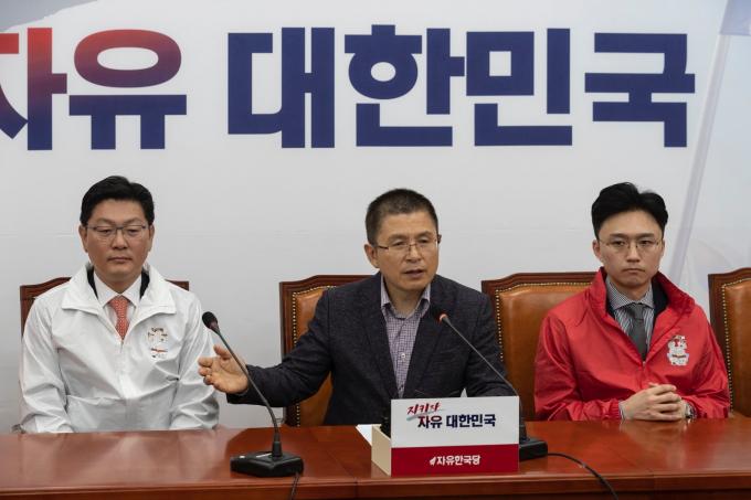 자유한국당 황교안 대표(왼쪽 네번째)가 31일 오후 서울 여의도 국회에서 열린 한국당 영입인재 환영식에 참석해 인사말을 하고 있다.
