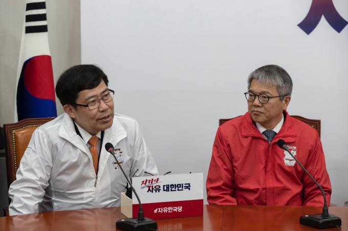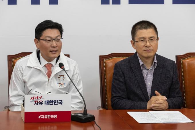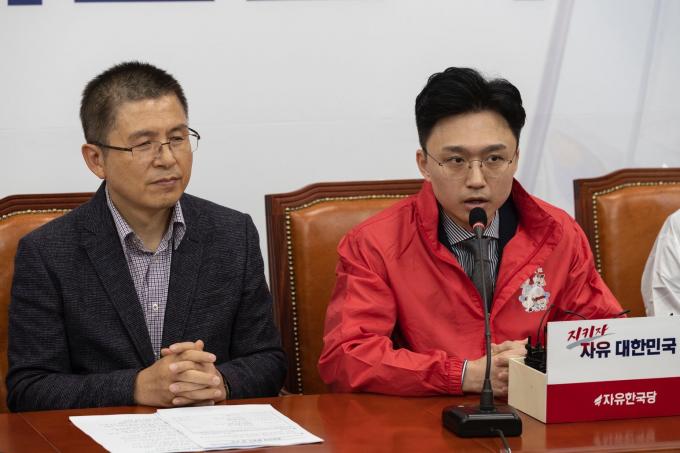 김용하 순천향대 IT금융학과 교수(왼쪽)가 31일 서울 여의도 국회에서 열린 한국당 영입인재 환영식에 참석해 인사말을 하고 있다.