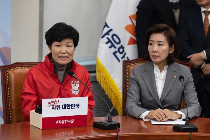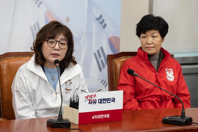 양금희 여성유권자연맹회장(왼쪽)이 31일 서울 여의도 국회에서 열린 한국당 영입인재 환영식에 참석해 인사말을 하고 있다.