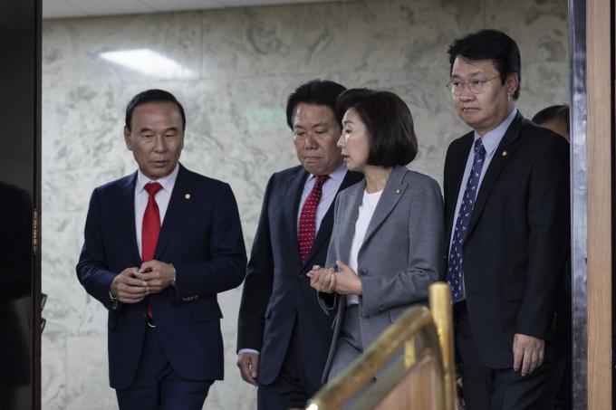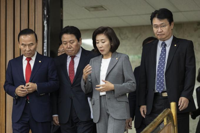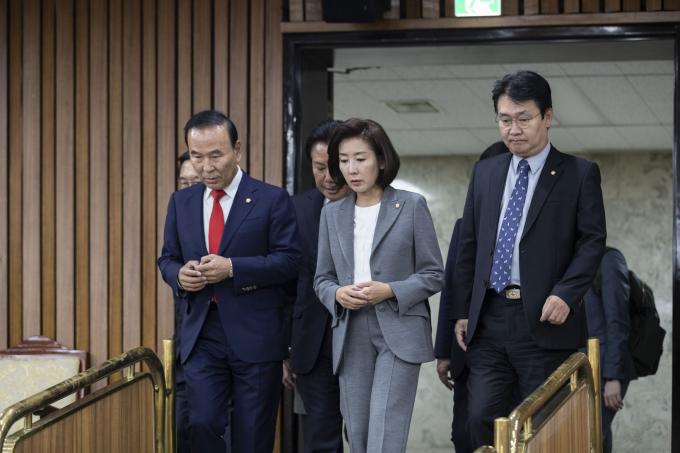 자유한국당 나경원 원내대표(가운데)가 1일 오전 서울 여의도 국회에서 열린 한국당 원내대책회의에 참석하고 있다.