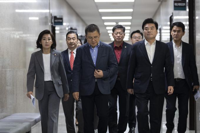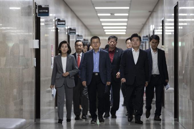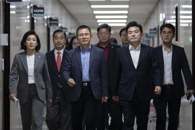 자유한국당 황교안 대표(앞줄 가운데), 나경원 원내대표(앞줄 왼쪽)가 1일 오전 서울 여의도 국회에서 열린 한국당 북핵외교안보특위 및 국가안보위원회 긴급연석회의에 참석하기 위해 이동하고 있다.