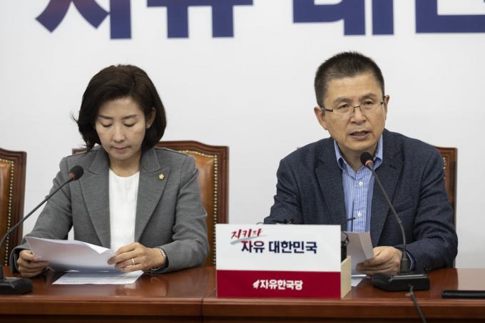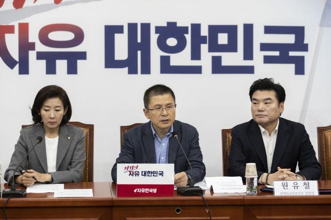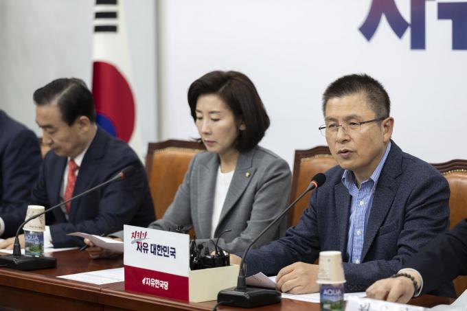 자유한국당 황교안 대표(오른쪽)가 1일 오전 서울 여의도 국회에서 열린 한국당 북핵외교안보특위 및 국가안보위원회 긴급연석회의에 참석해 발언하고 있다.