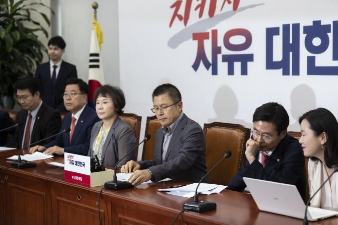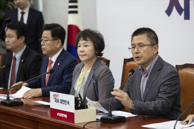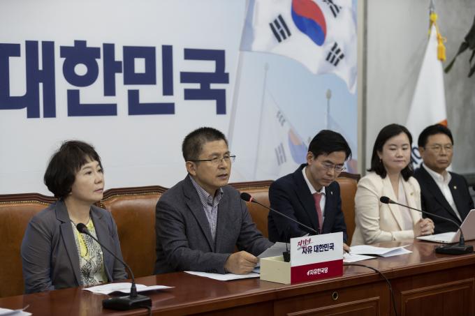 황교안(왼쪽 두번째) 자유한국당 대표가 4일 오전 서울 여의도 국회에서 열린 한국당 최고위원회의에 참석해 발언하고 있다.
