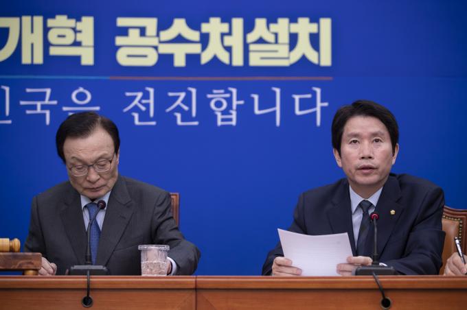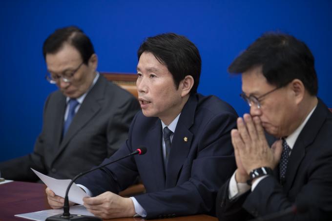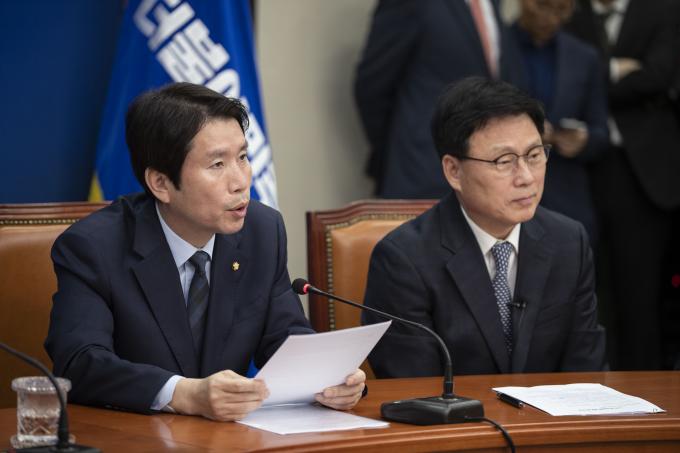 이인영(왼쪽) 더불어민주당 원내대표가 4일 오전 서울 여의도 국회에서 열린 민주당 최고위원회의에 참석해 발언하고 있다.