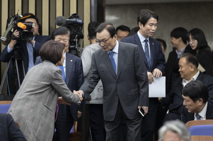 더불어민주당 이해찬 대표와 이인영 원내대표가 4일 오후 서울 여의도 국회에서 열린 민주당 의원총회에 참석하고 있다.