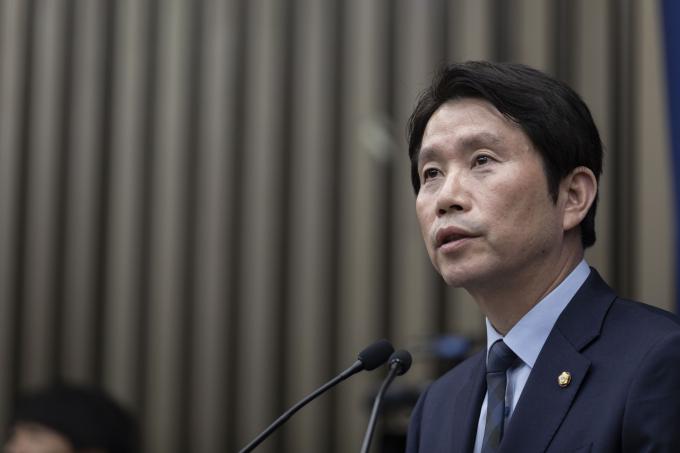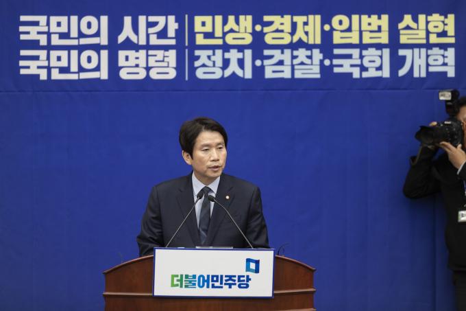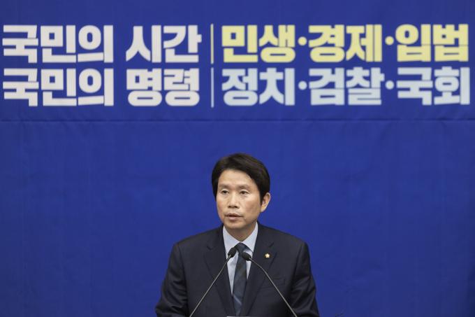 더불어민주당 이인영 원내대표가 4일 오후 서울 여의도 국회에서 열린 민주당 의원총회에 참석해 발언하고 있다.