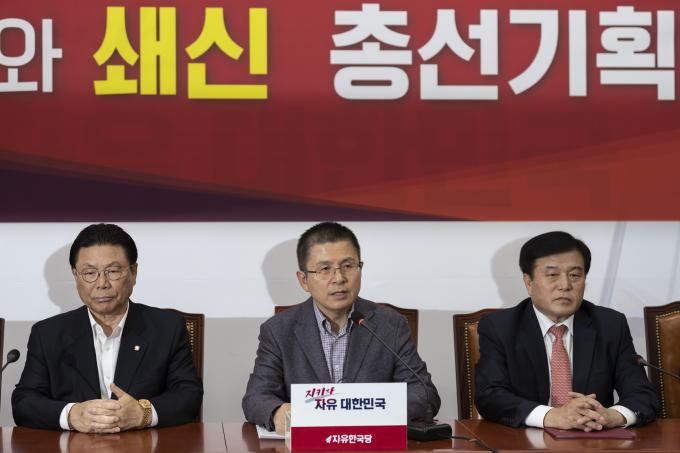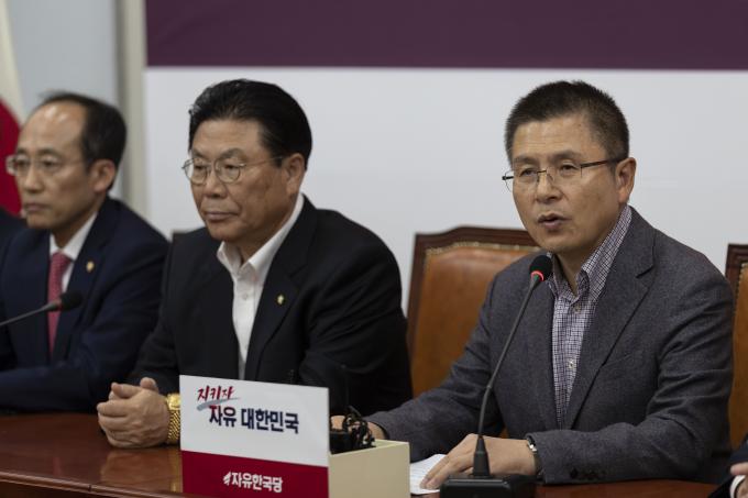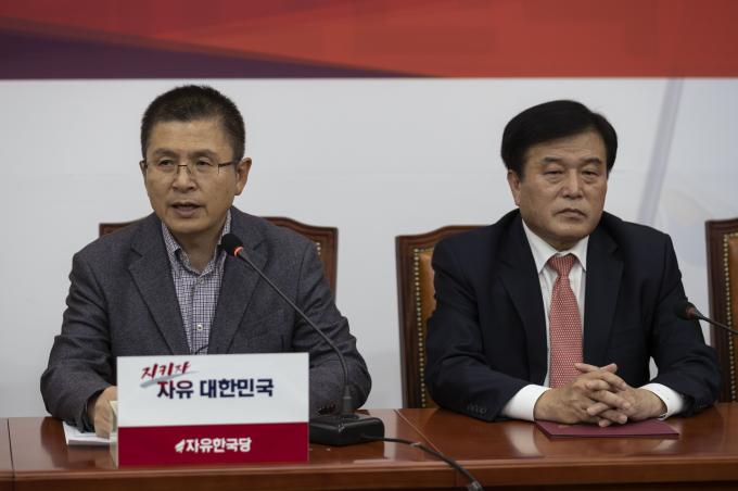 자유한국당 황교안 대표(오른쪽)가 4일 오후 서울 여의도 국회에서 열린 총선기획단 1차회의에 참석해 발언하고 있다.