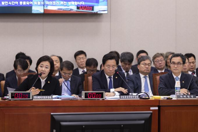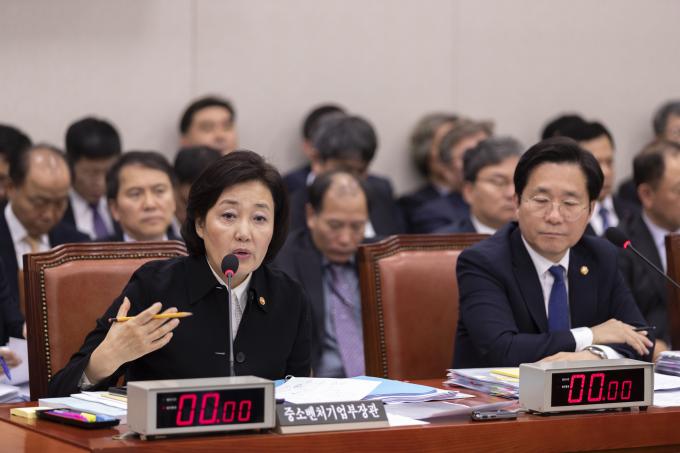 박영선 중소벤처기업부 장관(왼쪽)이 4일 오후 서울 여의도 국회에서 열린 산업통상자원중소벤처기업위원회 전체회의에 출석해 의원 질의에 답하고 있다.