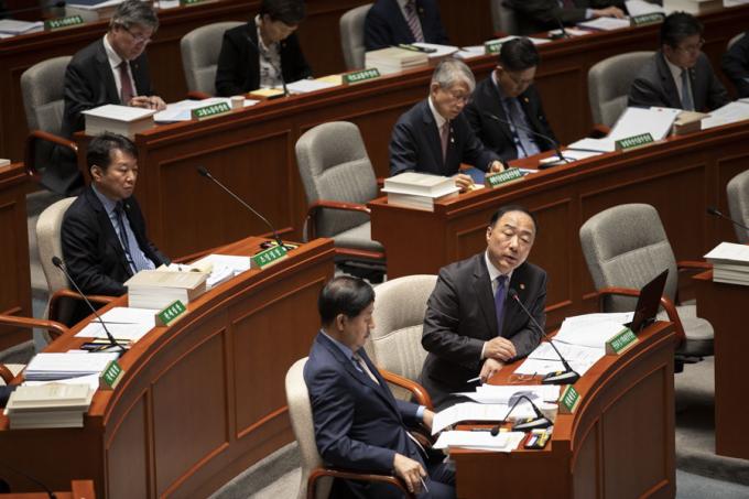 홍남기 경제부총리 겸 기획재정부 장관이 4일 오후 서울 여의도 국회에서 열린 예산결산특별위원회 전체회의에 출석해 의원 질의에 답하고 있다.