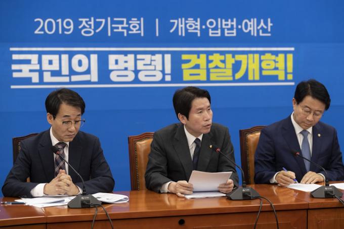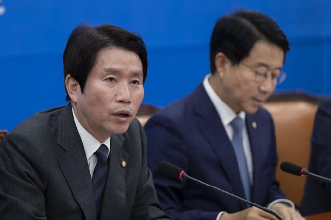 더불어민주당 이인영 원내대표(가운데)가 5일 오전 서울 여의도 국회에서 열린 민주당 원내대책회의에 참석해 발언하고 있다.