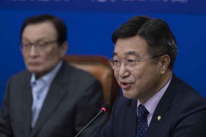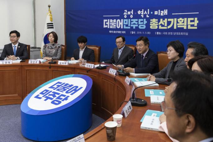 윤호중 총선기획단 단장(왼쪽 다섯번째)이 5일 오전 서울 여의도 국회에서 열린 민주당 제1차 총선기획단 회의에 참석해 발언하고 있다. 더불어민주당은 지난 4일 내년 총선 준비에 본격 돌입해 총선기획단을 구성했다. 총선기획단장엔 윤호중 당 사무총장(55)이 임명됐고, 양정철 민주연구원장(55) 등 15명으로 구성됐다.