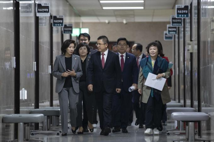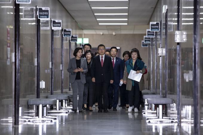 자유한국당 황교안 대표(가운데), 나경원 원내대표(왼쪽)가 6일 오전 서울 여의도 국회에서 열린 한국당 당대표 및 최고위원-중진의원 연석회의에 참석하기 위해 이동하고 있다.