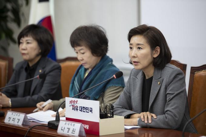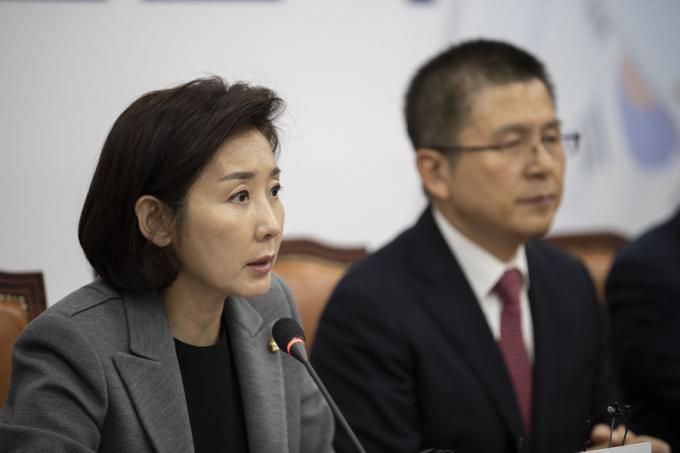 자유한국당 나경원 원내대표(왼쪽)가 6일 오전 서울 여의도 국회에서 열린 당대표 및 최고위원-중진의원 연석회의에 참석해 발언하고 있다.