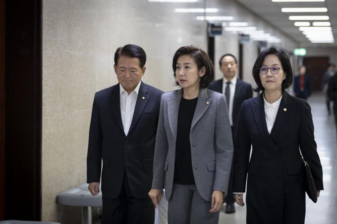 자유한국당 나경원 원내대표(가운데)가 6일 오후 서울 여의도 국회에서 열린 '정치 편향교육 실태 관련 교육시민단체 전문가 정책간담회'에 참석하기 위해 이동하고 있다. 왼쪽부터 김한표 교육위 간사, 나 원내대표, 김현아 의원.