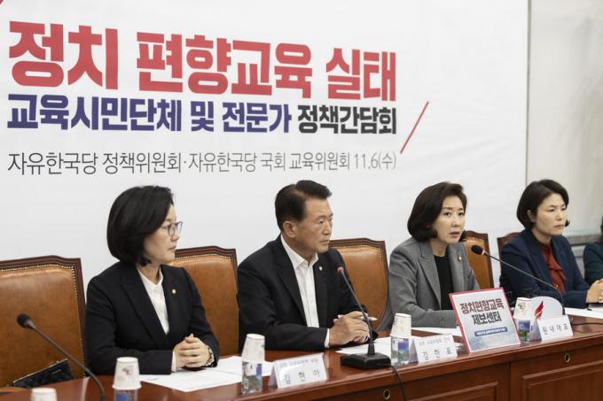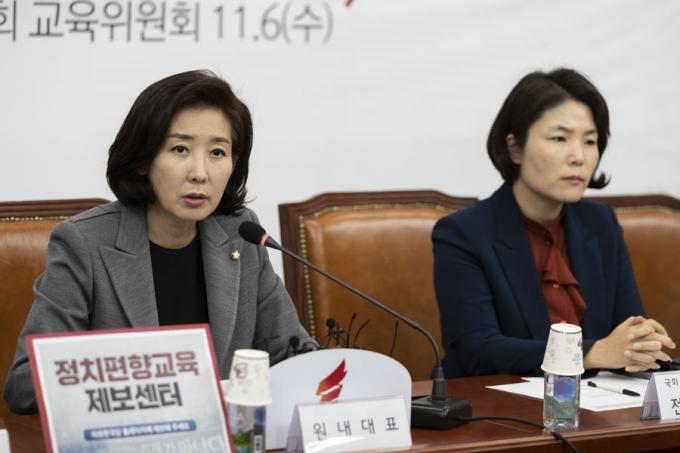 자유한국당 나경원 원내대표(왼쪽)가 6일 오후 서울 여의도 국회에서 열린 '정치 편향교육 실태 관련 교육시민단체 전문가 정책간담회'에 참석해 발언하고 있다.