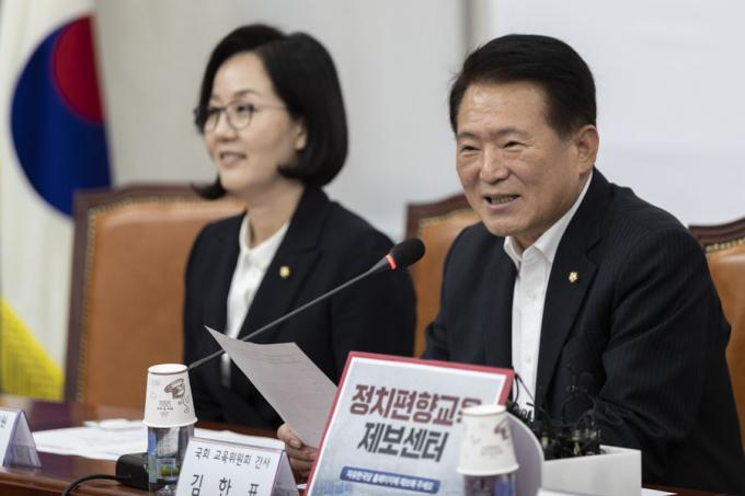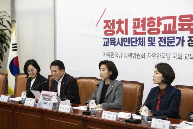 자유한국당 소속 김한표 교육위원회 간사(왼쪽 두번째)가 6일 오후 서울 여의도 국회에서 열린 '정치 편향교육 실태 관련 교육시민단체 전문가 정책간담회'에 참석해 발언하고 있다.