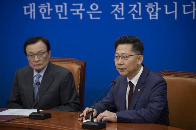 김현수 농림축산식품부 장관(오른쪽)이 6일 오후 서울 여의도 국회 더불어민주당 당대표실에서 이해찬 대표를 예방해 인사말을 하고 있다. 이해찬 대표는 김현수 장관에게 "부임하자마자 '아프리카돼지열병' 퇴치를 위해 불철주야 애쓰셨다"며 노고를 치하했다.