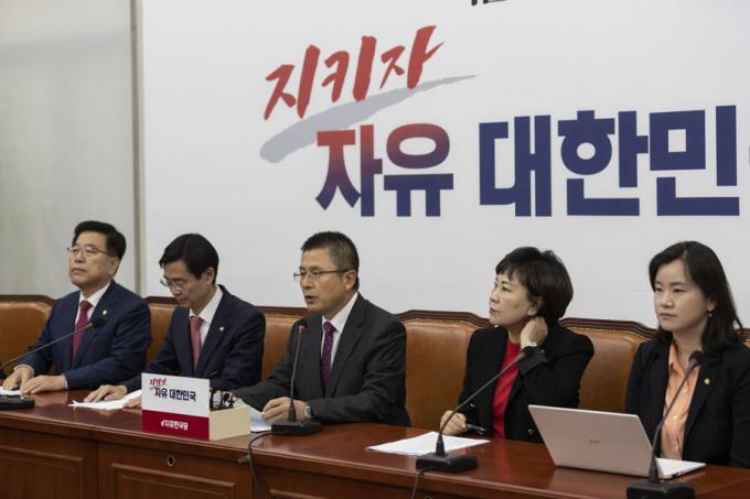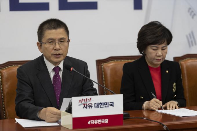 자유한국당 황교안 대표(가운데)가 7일 오전 서울 여의도 국회에서 열린 한국당 최고위원회의에 참석해 발언하고 있다.